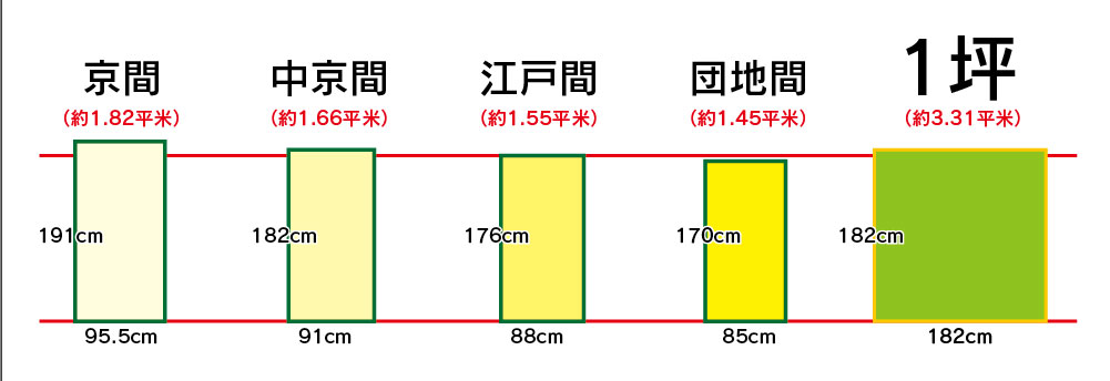 Tatami có kích thước phổ biến là 910mm x 1.820mm (tương đương 1,8m x 0.9m). Tuy nhiên, Tatami còn 3 loại kích thước chuẩn khác được áp dụng ở từng địa phương, nhưng nhìn chung tỷ lệ các cạnh của chiếu Tatami sẽ là 2:1.