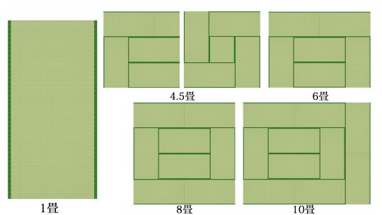 Tatami có 4 loại kích thước nhưng chỉ có 2 cách trải là Shyugi Shiki/ 祝儀敷きvà Fushyugi Shiki/ 不祝儀敷き. Shyugi Shiki là cách trải Tatami phổ biến, dùng trong gia đình ở Nhật. Nguyên tắc chung của cách trải này là hình chữ T (các cạnh ngắn sẽ tiếp giáp với cạnh dài) và các góc của chiếu không được chụm lại một điểm.